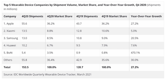 Apple dominierte auch im vierten Quartal 2020 den Wearables-Markt