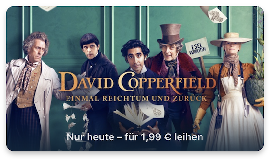 Auch heute hat Apple wieder den sogenannten "Movie Mittwoch" ausgerufen. Dabei wird jeden Mittwoch ein ausgewählter Film aus dem iTunes-Sortiment für 24 Stunden zum Sonderpreis von nur € 1,99 in HD-Qualität zum Leihen angeboten. In dieser Woche handelt es sich dabei um die Komödie David Copperfield - Einmal Reichtum und zurück die man zum Sonderpreis von € 1,99 erhält. Nachdem man den Leih-Film geladen hat, kann er innerhalb von 30 Tagen angeschaut werden. Wie immer bei geliehenen Filmen aus dem iTunes Store gilt: Hat man hiermit einmal begonnen, muss man ihn innerhalb von 48 Stunden beenden.
