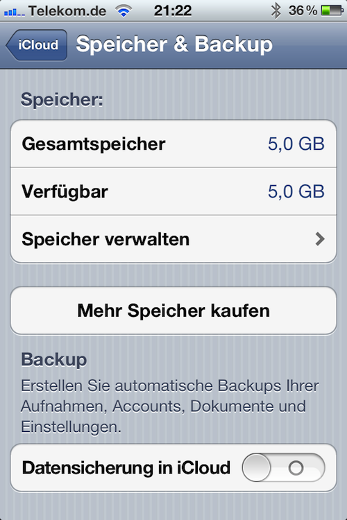 Die in der iCloud enthaltenen 5 GB Speicherplatz werden für Mail, Dokumente und Backup genutzt. Offenbar wird sich bei Bedarf auch noch mehr Speicherplatz kostenpflichtig hinzu buchen lassen. Musik, iBooks und Apps werden übrigens dabei nicht berechnet.
