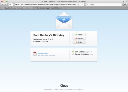 Macrumors zweifelt dies jedoch an und führt einen Leser ins Feld, der sich selbst eine Kalendereinladung über iOS 5 geschickt hat. In dieser befand sich ein Link zur iCloud.com Domäne, hinter der sich schließlich die Einladung in der Web-Ansicht befindet. Diese entspricht den aktuellen MobileMe-Einladungen, wurde von Apple aber bereits mit den iCloud-Merkmalen gebrandet.