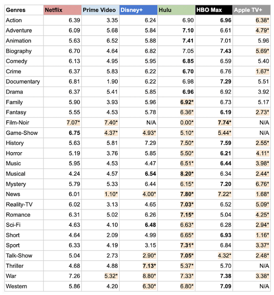 \u201eApple TVPlus has put most of its effort into dramas (47) but only averages 3.9 IMDb score per show.\u201c