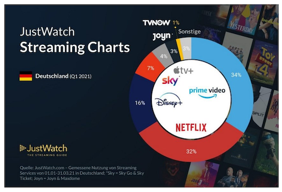 Trotz der gewaltigen Zahlen seiner in Umlauf befindlichen Geräte hinkt Apple mit seinem Streamingdienst Apple TV+ in Deutschland weiter deutlich der Konkurrenz hinterher. Dies geht aus aktuellen Zahlen von JustWatch hervor, wo man den Markt aktuell mal wieder genauer analysiert hat. Das Ergebnis: Apple TV+ landet im Deutschland-Vergleich lediglich auf Platz fünf. Deutlich an der Spitze liegen die beiden Platzhirschen Amazon Prime Video mit 34% hiesigen Marktanteil und Netflix mit 32%. Auf dem dritten Rang folgt dann das in etwa zeitgleich mit Apple TV+ gestartete Disney+, welches sich mit 16% den vierfachen Marktanteil von Apple TV+ sichern konnte. Zwischen den beiden Anbietern liegt noch Sky mit seinen Angeboten Sky Go und Sky Ticket und einem Marktanteil von 7% auf dem vierten Platz. Durchsetzen konnte sich Apple TV+ lediglich gegen Joyn mit einem Marktanteil von 3% und TVNOW mit lediglich 1%.