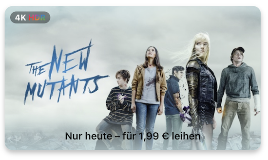 Auch heute hat Apple wieder den sogenannten "Movie Mittwoch" ausgerufen. Dabei wird jeden Mittwoch ein ausgewählter Film aus dem iTunes-Sortiment für 24 Stunden zum Sonderpreis von nur € 1,99 in HD-Qualität zum Leihen angeboten. In dieser Woche handelt es sich dabei um den Marvel-Streifen The New Mutants, den man zum Sonderpreis von € 1,99 erhält. Nachdem man den Leih-Film geladen hat, kann er innerhalb von 30 Tagen angeschaut werden. Wie immer bei geliehenen Filmen aus dem iTunes Store gilt: Hat man hiermit einmal begonnen, muss man ihn innerhalb von 48 Stunden beenden.