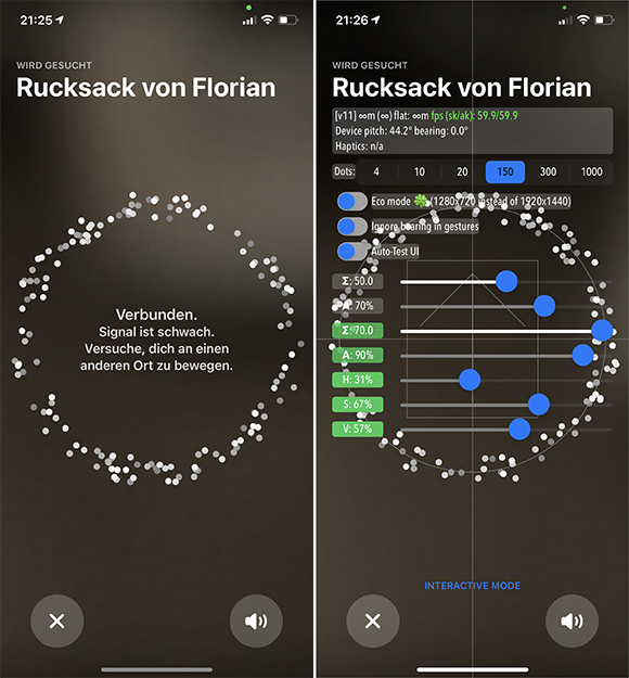 So werden auf dem eingeblendeten Screen verschiedene Echtzeit-Informationen und technische Daten zur Suche des AirTags angezeigt, inkl. solcher, die vom Beschleunigungssensor und dem Gyroskop des iPhone stammen. Man findet in dem Menü auch verschiedene Schieberegler, von denen ich aber vorsichtshalber die Finger lassen würde, wenn man nicht genau weiß, was man tut. Im Zweifel zerschießt man sich hierbei sonst das Auffinden der AirTags über die "Genaue Suche".