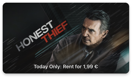 Auch heute hat Apple wieder den sogenannten "Movie Mittwoch" ausgerufen. Dabei wird jeden Mittwoch ein ausgewählter Film aus dem iTunes-Sortiment für 24 Stunden zum Sonderpreis von nur € 1,99 in HD-Qualität zum Leihen angeboten. In dieser Woche handelt es sich dabei um den Action-Streifen Honest Thief mit Liam Neeson, den man zum Sonderpreis von € 1,99 erhält. Nachdem man den Leih-Film geladen hat, kann er innerhalb von 30 Tagen angeschaut werden. Wie immer bei geliehenen Filmen aus dem iTunes Store gilt: Hat man hiermit einmal begonnen, muss man ihn innerhalb von 48 Stunden beenden.