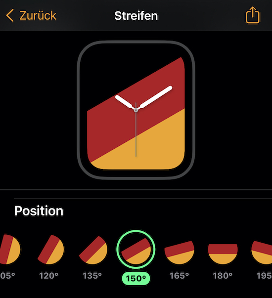 Innerhalb der Watch-App auf dem iPhone lässt sich das Zifferblatt dann sogar auf Wunsch weiter personalisieren. So können die drei Streifen der deutschen Flagge beispielsweise in unterschiedlich gedrehten Winkeln genutzt werden.