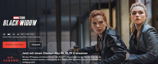Zwar haben viele Kinos nach den niedrigen Corona-Infektionszzahlen der vergangenen Wochen inzwischen wieder geöffnet, dennoch hat man sich bei Marvel dazu entschieden, die Premiere des neuesten Blockbusters "Black Widow" nicht nur auf der großen Leinwand, sondern auch über den Streamingdienst Disney+ abzuwickeln. Dort ist der Streifen ab heute über einen sogenannten VIP-Zugang verfügbar. Hierfür wird für Disney+ Abonnenten neben der regulären Abo-Gebühr eine Einmalzahlung in Höhe von € 21,99 für den Zugriff auf den neuen Film fällig. So lange man Abonnent bleibt, kann man "Black Widow" im Anschluss dann aber immerhin so oft schauen wie man möchte. Ein ähnliches Konzept ist man bereits im vergangenen Jahr durchaus erfolgreich bei "Mulan" gefahren. Entscheidet man sich für den VIP-Zugang und damit die Heimpremiere von Black Widow, erhält man den Film satte drei Monate vor dem generellen Streamingstart des Films auf Disney+ im Oktober.