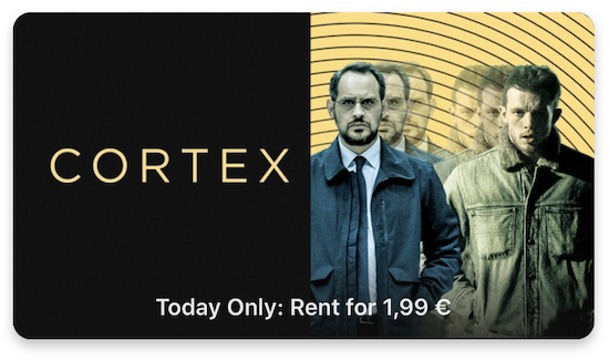 Auch heute hat Apple wieder den sogenannten "Movie Mittwoch" ausgerufen. Dabei wird jeden Mittwoch ein ausgewählter Film aus dem iTunes-Sortiment für 24 Stunden zum Sonderpreis von nur € 1,99 in HD-Qualität zum Leihen angeboten. In dieser Woche handelt es sich dabei um den deutschen Thriller Cortex mit Moritz Bleibtreu, das man zum Sonderpreis von € 1,99 erhält. Nachdem man den Leih-Film geladen hat, kann er innerhalb von 30 Tagen angeschaut werden. Wie immer bei geliehenen Filmen aus dem iTunes Store gilt: Hat man hiermit einmal begonnen, muss man ihn innerhalb von 48 Stunden beenden.