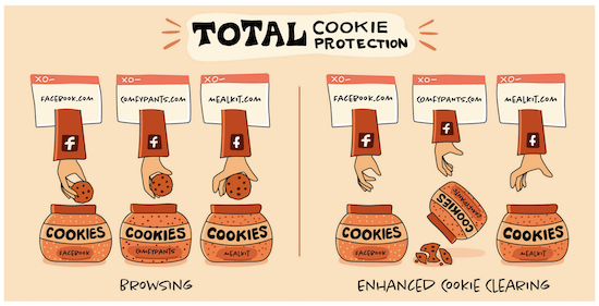 Total Cookie Protection, built into Firefox, makes sure that facebook.com can’t use cookies to track you across websites. It does this by partitioning data storage into one cookie jar per website, rather than using one big jar for all of facebook.com’s storage. With Enhanced Cookie Clearing, if you clear site data for comfypants.com, the entire cookie jar is emptied, including any data facebook.com set while embedded in comfypants.com.