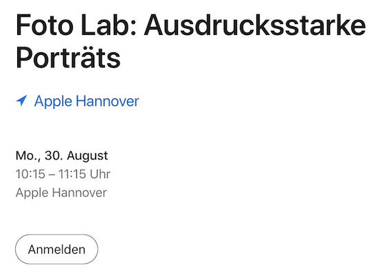 Und siehe da, auch hierzulande lassen sich in der Tat inzwischen die ersten Termine schon wieder buchen. Ab Ende des Monats finden sich inzwischen verschiedene sogenannte In-Person Sessions, wie die auf dem nachfolgenden Screenshot im Store in Hannover.