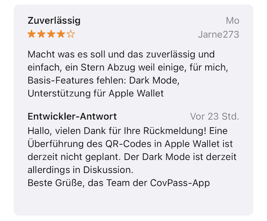 Zuletzt gab es auf Basis von Rückmeldungen der Entwickler auf AppStore-Rezensionen Hoffnung, dass hieran evtl. doch noch gearbeitet werden könnte. So hieß es dort, "eine Überführung des QR-Codes in Apple Wallet ist derzeit in Diskussion".