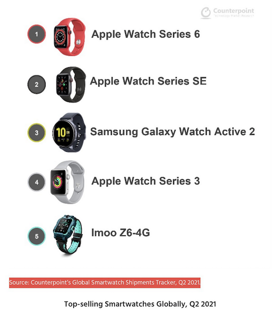 Star unter den verschiedenen Modellen ist die Apple Watch Series 6, gefolgt von der Apple Watch SE und der Samsung Galaxy Watch Active 2. Mit der Series 3 befindet sich eine weitere Apple Watch in den Top 5 der meistverkauften Smartwatches im zweiten Quartal 2021.