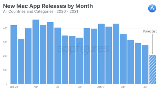 Während der iOS AppStore ein durch und durch großer Erfolg ist und von einer neuen Bestmarke zur nächsten hastet, ist es Apple seit seinem Start im Jahr 2010 nicht gelungen, diesen Erfolg auch auf den Mac AppStore zu übertragen. Im Gegenteil: Eine neue Studieder Analysten von AppFigures zeigt nun, dass das Interesse der Entwickler, ihre Apps über den Mac AppStore zu vertreiben nachlässt. Seit Beginn des Jahres hat die Zahl der neuveröffentlichten Apps demnach stetig abgenommen. Während im Januar noch über 400 neue Apps im Mac AppStore veröffentlicht wurden, waren es im Juni weniger als 300. Für den August sagen die Analysten sogar nur um die 200 neue Mac-Apps voraus. Auch gegenüber den Vorjahren hat das Interesse in 2021 weiter abgenommen.