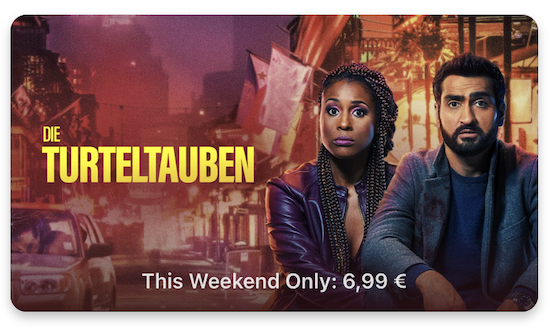 Darüber hinaus lässt sich die BollywoodKomödie Die Turteltauben nur über das Wochenende zum Preis von € 6,99 käuflich im iTunes Store erwerben. Einmal gekaufte Filme lassen sich jederzeit erneut aus dem iTunes Store herunterladen und sind auf allen verbundenen Geräten uneingeschränkt nutzbar.