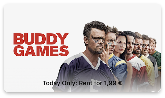 Auch heute hat Apple wieder den sogenannten "Movie Mittwoch" ausgerufen. Dabei wird jeden Mittwoch ein ausgewählter Film aus dem iTunes-Sortiment für 24 Stunden zum Sonderpreis von nur € 1,99 in HD-Qualität zum Leihen angeboten. In dieser Woche handelt es sich dabei um die Komödie Buddy Games, die man zum Sonderpreis von € 1,99 erhält. Nachdem man den Leih-Film geladen hat, kann er innerhalb von 30 Tagen angeschaut werden. Wie immer bei geliehenen Filmen aus dem iTunes Store gilt: Hat man hiermit einmal begonnen, muss man ihn innerhalb von 48 Stunden beenden.
