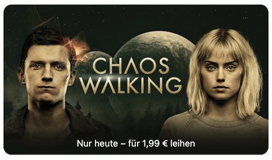 Auch heute hat Apple wieder den sogenannten "Movie Mittwoch" ausgerufen. Dabei wird jeden Mittwoch ein ausgewählter Film aus dem iTunes-Sortiment für 24 Stunden zum Sonderpreis von nur € 1,99 in HD-Qualität zum Leihen angeboten. In dieser Woche handelt es sich dabei um den Action-Kracher Chaos Walking mit Gal Gadot, den man zum Sonderpreis von € 1,99 erhält. Nachdem man den Leih-Film geladen hat, kann er innerhalb von 30 Tagen angeschaut werden. Wie immer bei geliehenen Filmen aus dem iTunes Store gilt: Hat man hiermit einmal begonnen, muss man ihn innerhalb von 48 Stunden beenden.