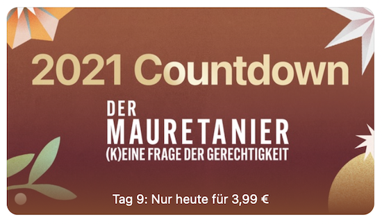 Das Weihnachtsfest rückt mal wieder näher und während sich bei manchen Freude und Besinnlichkeit breit macht, kommt bei anderen eher Hektik beim Weihnachtsshopping auf. Vor allem für Kinder bedeutet die Zeit bis zum Weihnachtsfest jeden Tag ein bisschen Freude beim Öffnen der Türen des Adventskalenders. Auch Apple bietet in diesem Jahr wieder eine Dezember-Aktion an und weitet diese gar auf 31 Tage, also bis zum Ende des Monats aus. Unter dem Motto "2021 Countdown" wird man dabei jeden Tag mit einem neuen Inhalt aus dem Film-Bereich des iTunes Store zum Sonderpreis beschenkt. Heute erhält man auf diese Weise das Drama Der Mauretanier - (K)eine Frage der Gerechtigkeit für nur € 3,99 zu kaufen.