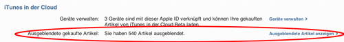 alle jemals erworbenen Artikel aufgetaucht sind. Ihr könnt euch sicher einigermaßen vorstellen, wie viele das in meinem Fall gewesen sind. Von Übersichtlichkeit also keine Spur. Inzwischen ist es jedoch möglich, einzelne Apps aus dieser Ansicht auzublenden. Dies funktioniert sowohl auf den iOS-Geräten (seitlich über den Artikel wischen), als auch über iTunes am Rechner (im Bereich "Gekaufte Artikel"; Maus über das Icon und anschließend das erscheinende X anklicken). Bei vielen Apps hat es durchaus einen Grund, warum man sie mal gelöscht hat, nun kann man sie also auch aus der iCloud-Übersicht ausblenden. Auch der Mac AppStore verfügt unter OS X 10.7.2 über eine solche Funktion. Doch Apple hat sogar noch weiter gedacht über die iTunes-Account-Einstellungen kann man auch die ausgeblendeten Artikel bei Bedarf wieder zurück holen. Und selbstverständlich können auch die ausgeblendeten Artikel nach wie vor erneut kostenlos über den Store geladen werden. Die Übersicht ist nun also wiederhergestellt. Vielen Dank, Apple!