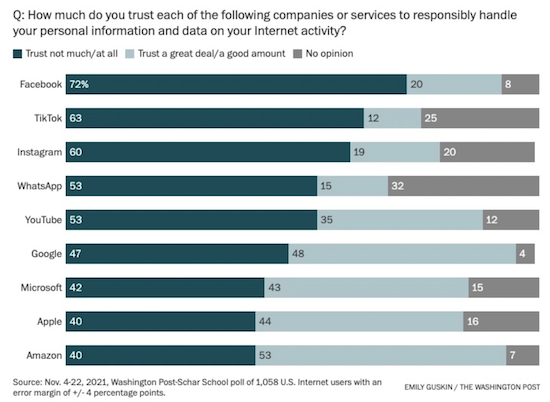 Während die Umfrage einen gewissen Eindruck zur Stimmung vermittelt, darf allerdings nicht vernachlässigt werden, dass es sich um eine recht kleine Stichprobe von nur 1.058 zufällig ausgewählten Umfrageteilnehmern handelt und die Analysten eine Fehlerspanne von +/-4% angeben. Unbestritten dürfte allerdings sein, dass die Nutzer Facebook, WhatsApp, Instagram und TikTok deutlich weniger trauen als beispielsweise Apple, Microsoft und Amazon.