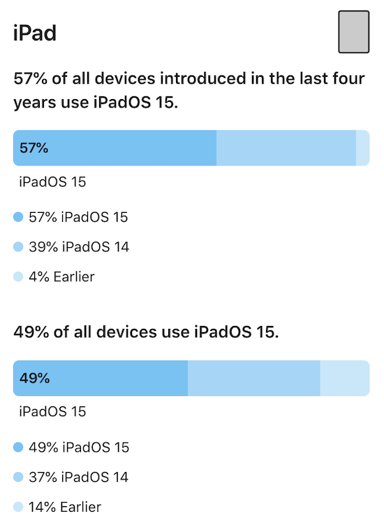 Auf dem iPad sieht es für iPadOS 15 sogar noch ein wenig schlechter aus. Lediglich 57% der in den vergangenen vier Jahren veröffentlichten iPads sind bereits mit iPadOS 15 unterwegs, während 39% noch unter iPadOS 14 und 4% unter einer noch älteren Version laufen. Zählt man auch die älteren iPads mit, kommt iPadOS 15 auf 49%, iPadOS 14 auf 37% und ältere iPadOS- bzw. iOS-Versionen auf 14%.