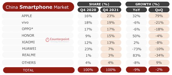 Das iPhone war im 4. Quartal 2021 das am meisten Verkaufte Smartphone in China