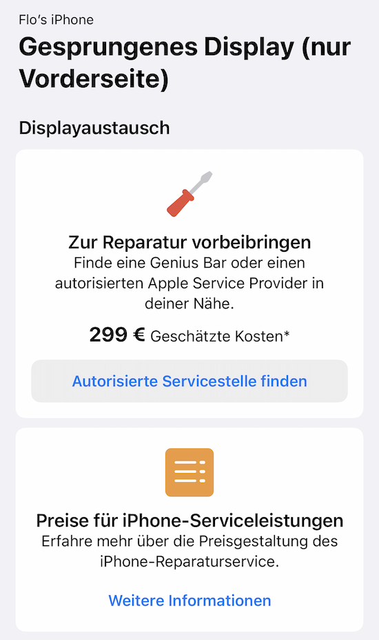 Zugegeben, Apples offizielle Support-App (kostenlos im AppStore) gehört nicht zu den Apps, die ich häufig benutze. Der Funktionsumfang hielt sich allerdings bislang auch durchaus in Grenzen. Am heutigen Abend hat Apple der App aber mal wieder eines der seltenen Updates verpasst und dabei unter anderem eine neue Funktion eingeführt, durch die man sich in ausgewählten Regionen einen Schätzpreis für eine Gerätereparatur anzeigen lassen kann. Zu diesen Regionen gehört auch Deutschland. Wählt man für eines der eigenen Geräte also den Menüpunkt "Reparaturen und physischer Schaden" aus, kann man den zu behebenden Schaden anschließend weiter eingrenzen und bekommt dann einen geschätzten Preis für die Raparatur angezeigt. Anschließend kann man dann selbstverständlich auch einen entsprechenden Termin in einem Apple Retail Store oder bei einem autorisierten Service Partner buchen.