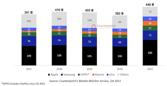 Kurz nachdem bekannt wurde, dass der iOS AppStore deutlich mehr Umsätze per In-App Käufe generiert als sein Android-Pendant, haben die Marktanalysten von Counterpoint nun verneldet, dass das iPhone 13 im vergangenen Jahr mit einem neuen Rekordumsatz von 448 Milliarden US-Dollar an der weltweiten Spitze der Smartphones stand. Der gesamte Smartphone-Markt wuchs trotz der weltweiten Chipkrise insgesamt um 7% im Jahresvergleich, wobei das iPhone einen deutlich größeren Sprung vollzog und somit den gesamten Markt nach oben zog. Allein im vierten Quartal soll der Umsatz bei 196 Milliarden Dollar gelegen haben, was im Jahresvergleich einem Anstieg von 35% entspräche. Hier macht sich allerdings im Vergleich zur Android-Konkurrenz vor allem auch der vergleichsweise hohe Verkaufspreis des iPhone bemerkbar.