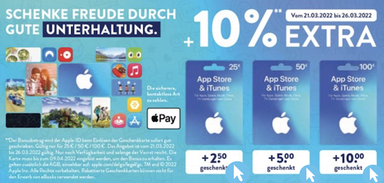 Die neue Woche beginnt mit guten Nachrichten für alle Schnäppchenjäger: Es gibt wieder vergünstigte iTunes-Geschenkkarten. So sind es ab heute die Filialen der Supermarktkette ALDI Nord und ALDI Süd, die die Karten mit einem Zusatz-Guthaben in Höhe von 10% auf den regulären Kartenwert anbieten. Dies gilt pauschal für alle Karten im Wert von € 25,-, € 50,- und €100,-. Aber Achtung: Die Aktion gilt nur bis Samstag, den 26. März 2022, bzw. solange der Vorrat reicht. Die Anzahl der Karten pro Kauf ist anscheinend nicht begrenzt. Man sollte also im Zweifel schnell sein, um noch rechtzeitig zuschlagen zu können. Schließlich haben die Karten ja kein Verfallsdatum. Der aufgedruckte Wert der Karten und das Zusatz-Guthaben können sowohl für Musik, als auch für Fernsehserien, Filme und Einkäufe im Mac- und iOS-AppStore genutzt werden. (mit Dank an alle Tippgeber!)