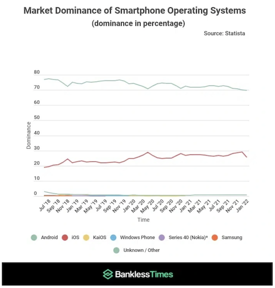 Android ist wenig überraschend nach wie vor das dominierende mobile Betriebssystem. Allein die Tatsache, dass es auf den Endgeräten der unterschiedlichsten Hersteller eingesetzt wird, verschafft ihm natürlich einen großen Reichweitenvorteil gegenüber Apples iOS. Allerdings verkleinerte sich zuletzt der Abstand zwischen den beiden Systemen, was ohne Zweifel als Erfolg für Apple gewertet werden kann. So geht aus den aktuellen Zahlen von StockApps hervor, dass Android aktuell auf einen Marktanteil von 69,74% kommt. Vor vier Jahren, im Juli 2018 waren es allerdings noch 77,32%. Im selben Zeitraum konnte iOS hingegen von 19,4% auf 25,49% zulegen.