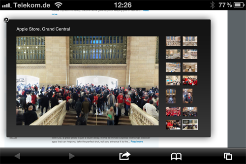 Ein wenig versteckt hat Apple eine sehr schöne 360°-Ansicht seines am vergangenen Freitag eröffneten, weltweit größten Retail Stores in der New Yorker Grand Central Station veröffentlicht, die noch dazu auf die Möglichkeiten des Gyroskops im iPhone 4, iPhone 4S, iPad 2 und aktuellen iPod touch zurück greift und diese sehr schön verdeutlicht. Zur Nutzung ruft man die Webseiten des Grand Central Store auf einem iOS-Gerät mit Gyroskop auf und tippt auf den Button "View More Photos" auf dem großen Bild links unten. Hierauf öffnet sich ein Overlay-Fenster, welches in der rechten Leiste weitere Fotos anbietet. Das Foto ganz unten rechts trägt die Aufschrift "360°". Sobald man dieses öffnet, kann man es entweder mit den Fingern bewegen, oder aber durch Bewegungen des Geräts in die entsprechende Richtung. Eine hübsche kleine Spielerei, die das Gyroskop auch endlich mal in Aktion zeigt. (via TNW)