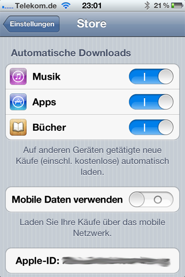 Eine weitere hiermit einhergehende Funktion ist der automatische Download von Musik aus dem iTunes Store. Soll heißen, wenn man beispielsweise am heimischen Mac einen Musiktitel lädt, wird dieser auch automatisch und ohne weiteres Zutun auf allen anderen entsprechend konfigurierten Geräten heruntergeladen. Allerdings müssen sowohl iTunes, als auch die iOS-Geräte hierfür zunächst freigeschaltet werden. Auf den iOS-Geräten geschieht dies in den Einstellungen, in der Sektion "Store".