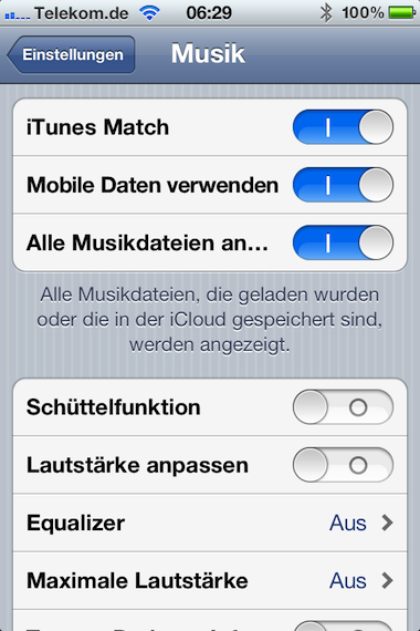 iTunes Match ist meiner Meinung nach die vermutlich beste Erfindung seit der Erfindung des iTunes Store. Für weniger interessant als die Aufwertung der Dateien halte ich die Möglichkeit, auf diese Art und Weise quasi wirklich die komplette Mediathek immer und überall verfügbar zu haben. Ich regele dies in meinem Fall folgendermaßen. Ich habe mein iPhone auf iTunes Match umgestellt und die beiden Schalter darunter deaktiviert. Prinzipiell ist dann alles wieder so, wie auch bei der normalen Synchronisierung, soll heißen, alles was ichj vorher schon offline auf dem Gerät hatte, habe ich nach wie vor offline auf dem Gerät. Für den Fall das ich aber doch mal eines oder mehrere andere Lieder aus meiner Mediathek benötige, aktiviere ich einfach die Option "Alle Musikdateien anzeigen" und lade mir die gewünschten Titel aus der iCloud herunter. Bei Bedarf kann ich das sogar durch Aktivieren der Option "Mobile Daten verwenden" auch jederzeit von unterwegs machen. Einfach genial, genial einfach!