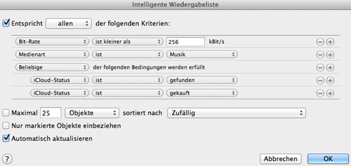 Zunächst legt man sich eine neue intelligente Wiedergabeliste an, mit der man sich alle Lieder aus der Mediathek herausfiltert, die unterhalb der von Apple angebotenen 256 Kbps Qualität liegen. Bei den Kriterien der Playlist wählt man zunächst "Bit-Rate -> ist kleiner als -> 256 kBit/s" und klickt anschließend auf das Plus-Zeichen, um ein weiteres Kriterium hinzuzufügen. Dieses setzt man dann auf "Medienart -> ist -> Musik". Anschließend klickt man mit gedrückter Alt-Taste auf den Button mit den drei Punkten, der dann an Stelle des Plus-Zeichens erscheint. Hier wählt man aus "Beliebige der folgenden Bedingungen werden erfüllt" und setzt dann die Kriterien "iCloud-Status -> ist -> gefunden" und "iCloud-Status -> ist -> gekauft".