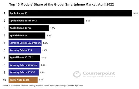 Bevor im Herbst die neue iPhone 14 Familie auf den Markt kommt, dominiert Apple mit den Geräten der iPhone 13 Reihe weiter den internationalen Smartphone-Markt. Dies geht aus aktuellen Daten der Analysten von Counterpoint Research hervor, denen zufolge Apple im April dieses Jahres gleich fünf Plätze in den Top 10 der meistverkauften Smartphones belegte, darunter auch die ersten vier Ränge. Auf den ersten drei Plätzen befinden sich dabei mit dem iPhone 13, dem iPhone 13 Pro Max und dem iPhone 13 Pro gleich drei Modelle aus der aktuellen iPhone-Generation. Den vierten Platz belegt das nach wie vor verkaufte iPhone 12, das iPhone SE aus dem Frühjahr kommt auf den siebten Rang. Auffällig abwesend ist das iPhone 13 mini, dem ohnehin ein schlechter Stand bei den Nutzern nachgesagt wird und von dem es auch im Herbst keinen Nachfolger in der iPhone 14 Familie geben soll.