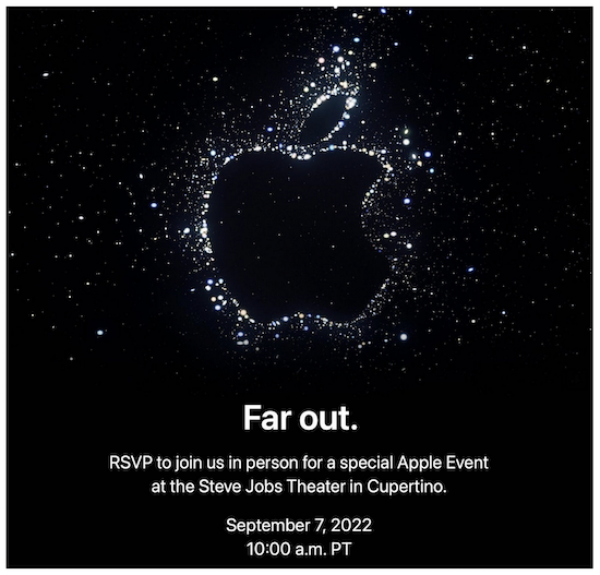 Die Gerüchte haben sich also bewahrheitet. Apple wird sein diesjähriges iPhone-Event am 07. September im Steve Jobs Theater am Apple Park abhalten. Anders als bei den letzten Events wird das diesjährige iPhone-Event allerdings doch mit Medienvertretern vor Ort durchgeführt werden und nicht rein virtuell steigen. Das Motto des Events lautet in diesem Jahr "Far out." und wird von der unten zu sehenden Einladung mit Sternenhimmel-Motiv begleitet. Die Ankündigungen für das Event trudeln derzeit bei den Kollegen der US-amerikanischen Technik-Presse ein. Erwartet werden in diesem Jahr erneut vier neue Modelle des iPhone 14, nämlich das iPhone 14, das iPhone 14 Max, das iPhone 14 Pro und das iPhone 14 Pro Max.