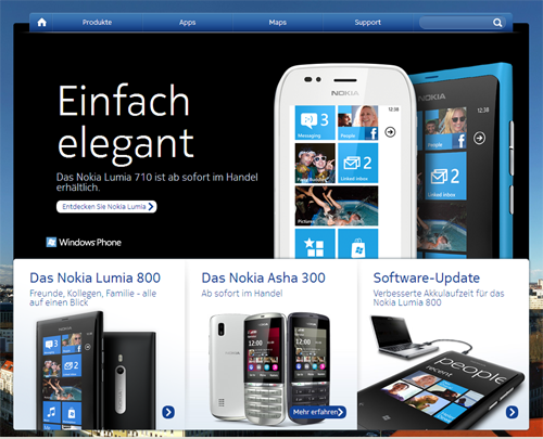 In einem Interview 1996 (hier bei YouTube zu sehen) zitierte einst Steve Jobs Pablo Picasso mit den Worten "Good artists copy, great artists steal." Dieser Leitspruch scheint sich auch bis in den hohen Norden nach Finnland herumgesprochen zu haben und so wollen nun anscheinend auch die Handy-Hersteller von Nokia "good artists" sein. Anders jedenfalls lässt sich der Anblick kaum erklären, der sich einem bietet, wenn man aktuell die Webseite des finnischen Unternehmens besucht. Die Parallelen zu Apples Webseite sind, wenn man es vorsichtig ausdrücken möchte, doch relativ groß. Oben eine horizontale Menüleiste mit links einem Home-Symbol statt eines Apfels und rechts einem Suchfeld, darunter ein gefeaturetes Produkt (witziger Weise auf beiden Seiten ein Smartphone) und darunter wiederum weitere Produkte in horizontal angeordneten Boxen. (mit Dank an Stefan für den Hinweis!)