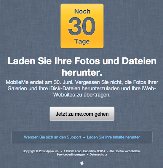 Das Ende naht und wirklich viele Freunde hat sich MobileMe seit seinem Start im Jahr 2008 nicht gemacht. Ja, selbst Steve Jobs sagte einst über MobileMe: "It was not our finest hour." Mit iCloud ist der Nachfolger bereits am Start und die ersten Dienste sind migriert. Am 30. Juni zieht Apple den verbleibenden MobileMe-Diensten dann endgültig den Stecker. Nicht zuletzt deswegen wurden am heutigen Tage auch E-Mails verschickt, in denen Apple über den verbleibenden Zeitraum informiert und die User dazu auffordert, Fotos aus den MobileMe-Galerien und Dateien aus der iDisk zu sichern, sowie die evtl. erstellten iWeb-Webseiten auf einen neuen Webspace zu übertragen. Speziell der Wegfall der Galerien und der iDisk sorgt bei einigen Usern für Unmut. Während die Galerien evtl. eine Zukunft in den sich mit iPhoto für iOS andeutenden Journalen haben könnten, ist für die iDisk bislang kein Ersatz bekannt. Allerdings halten sich hartnäckig Gerüchte, wonach Apple auf der in gut einer Woche beginnenden WWDC Erweiterungen für iCloud präsentiert. Aber das ist lediglich Spekulation, weswegen man den Aufforderungen aus der unten zu sehenden Mail zunächst einmal nachkommen sollte.
