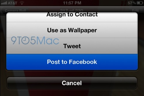 sein, der eine Zusammenarbeit mit dem weltweit größten sozialen Netzwerk für die nähere Zukunft in Aussicht stellte. Nun kommen gerüchtehalber immer mehr Details zu der möglichen Integration in iOS 6 ans Tageslicht. Wie 9to5Mac aktuell berichtet, wird die Integration in der Tat systemweit sein und in der Einbindung stark der bereits bestehenden Twitter-Integration ähneln. Besondere Bedeutung wird dabei wohl der Fotos- und vielleicht auch iPhoto-App zukommen. Dabei soll es dann möglich sein, Fotos direkt aus der App heraus bei Facebook zu veröffentlichen. Hierzu soll unter anderem ein Single Sign-On in den Einstellungen existieren, auf das alle die Facebook-API verwendenden Apps zugreifen können. Ähnlich wie bei der Twitter-Funktion soll dann auch Facebook seine eigene iOS-Ansicht für das Teilen von Inhalten bekommen. Zu diesen Inhalten sollen dann auch Apps aus dem AppStore gehören, die man über die Integration direkt "liken" kann. Ein Mockup zeigt, wie die Integration (wenig überraschend) aussehen könnte.