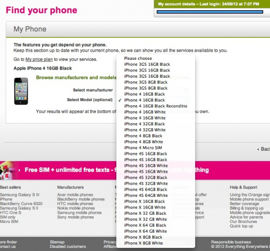 UPDATE, 10.09. um 17:08 Uhr: Es war letzten Endes nur eine Frage der Zeit, bis diese Meldung die Runde macht. Inzwischen wurde in den ersten Warenwirtschaftssystemen unbekannte iPhones mit der Bezeichnung "iPhone X" gesichtet. Den Anfang macht dieses Mal der britische Ableger von T-Mobile. Dort ist genanntes Gerät in vier Speicherkonfigurationen von 8 bis 64 GB gelistet. Es ist allerdings eher unwahrscheinlich, dass es auch das iPhone 5 mit 8 GB geben wird. Hierbei dürfte es sich um den Platzhalter für die neue Low-Budget Variante handeln. Interessant ist aber, dass die Geräte auch auf der externen Webseite aufgetaucht sind (siehe unten). Ob die Einträge nur auf Gerüchten basieren oder der Provider tatsächlich genaueres weiß, ist unbekannt.