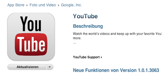 Es scheint der Abend der tollen Updates zu werden. Nicht nur hat Apple heute Abend die Apple TV Software aktualisiert, auch Google war aktiv, aktualisiert seine YouTube-App und bringt sie damit auch gleich in den deutschen AppStore. Gu möglich, dass die beiden Updates sogar zusammenhängen, schließlich ist auch in der neuesten Version der Apple TV Software nach wie vor eine YouTube-App enthalten. Sollte Apple das Update tatsächlich nicht zusammen mit iOS 6 in der vergangenen Woche aktualisiert haben, weil in Deutschland noch nicht alle Rechtsfragen in Bezug auf YouTube geklärt waren? Das bleibt natürlich reine Spekulation. Fest steht aber, dass die iOS-App nun auch hierzulande zu laden ist. Aufgrund ausgelaufener Verträge hatte Apple die bis dato in iOS mitgelieferte YouTube-App aus iOS 6 entfernt, woraufhin Google ankündigte, eine eigene App in den Store zu bringen. Diese tauchte dann in verschiedenen Stores rund um den Globus erstmals vor zwei Wochen auf. Nun hat das Warten also auch hierzulande ein Ende. Allerdings werden mit der aktuellen Version weder das iPad, noch das 4"-Display des iPhone 5 unterstützt. Auf dem iPad greift man bis zur Anpassung auf die (ebenfalls sehr gute) mobile Webansicht oder die Alternativ-App Jasmine (kostenlos im AppStore) zurück. Die YouTube-App kann ab sofort über den folgenden Link kostenlos aus dem AppStore geladen werden: YouTube