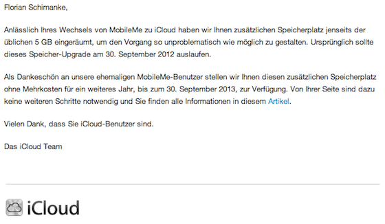 Ursprünglich sollte das von Apple für ehemalige MobileMe-Kunden eingerichtete, kostenlose Speicherupgrade beim Wechsel zu iCloud am 30. September ausgelaufen sein. Dies ist allerdings nicht eingetreten. Stattdessen tauchte zwischenzeitlich gar eine Laufzeit bis zum Jahr 2050 in den Einstellungen auf, was aber ganz offensichtlich nur ein kleiner Fehler war. In der vergangenen Nacht hat Apple nun die betroffenen Kunden per E-Mail kontaktiert und darüber informiert, dass die kostenlose Bereitstellung der zusätzlichen 20 GB bis zum 30. Septermber 2013 verlängert wurde. Ausführliche Informationen zur der Verlängerung liefertt Apple in einem speziellen Support-Dokument. Spannend ist dabei natürlich, warum Apple genau jene ehemaligen MobileMe-Mitglieder erst vor einigen Tagen ebenfalls per E-Mail darüber informiert hat, dass das nun verlängerte Upgrade in Kürze auslaufen würde. Vielleicht liegt es ja daran, dass auch Apple inzwischen festgestellt hat, dass die kostenlos in iCloud enthaltenen 5 GB doch ein bisschen wenig sind. Vor allem dann, wenn man mehr als nur ein iOS Geräte-Backup dort ablegen möchte. Ist aber eigentlich auch egal. Freuen wir uns einfach über die einjährige Verlängerung. (mit Dank an alle Tippgeber!)