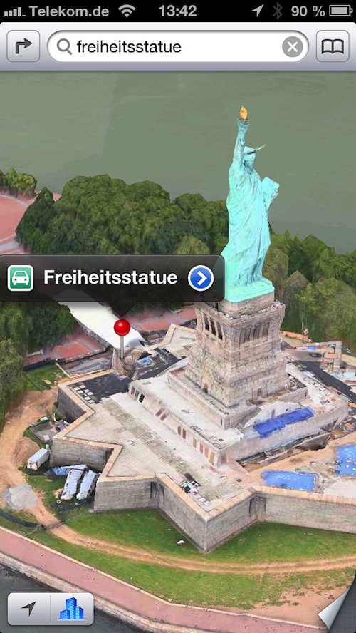 Selbstverständlich ist dies wenig hilfreich, wenn die Kartendaten, wie in den vergangenen Tagen oftmals kritisiert, schlicht nicht stimmen. Aber auch an dieser Front gibt es offenbar erste Fortschritte. So scheint Apple im Hintergrund bereits die von Tim Cook in seinem offenen Brief zu der Kritik angekündigten Verbesserungen in Angriff genommen zu haben. So berichten inziwschen verschiedene Nutzer vor allem aus den USA, dass sie inzwischen deutlich bessere Ergebniss bei der Nutzung der Karten-App erhalten. Dies betrifft vor allem die Fly-Over Daten, wie sich am Beispiel der Freiheitsstatue unten sehen lässt (links alt, rechts neu). Auch dies ist übrigens ein weiterer Vorteil daran, eine eigenes Backend für die Karten-Lösung zu haben. Änderungen und Verbesserungen kann Apple fortan in Eigenregie auf den Servern durchführen. Und es sieht ganz danach aus, als würde dies auch geschehen. (via MacRumors)