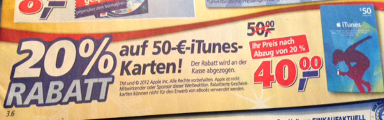 Achtung: Leider kann ich die Hinweise auf die günstigen iTunes-Karten nicht in jedem einzelnen Fall überprüfen. Checkt daher bitte vorher noch einmal ab, ob die jeweilige Filliale den Rabatt auch tatsächlich gewährt!