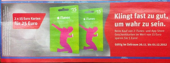 Achtung: Leider kann ich die Hinweise auf die günstigen iTunes-Karten nicht in jedem einzelnen Fall überprüfen. Checkt daher bitte vorher noch einmal ab, ob die jeweilige Filliale den Rabatt auch tatsächlich gewährt!