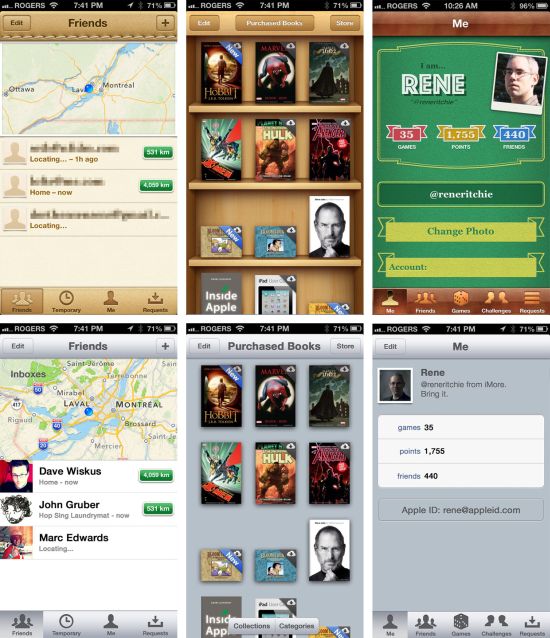 Abschließend der oben bereits kurz angerissene optische Vergleich von aktuell durch Skeuomorphismus geprägten Apps (oben) mit einer möglichen Neugestaltung (unten) von Rene Ritchie.