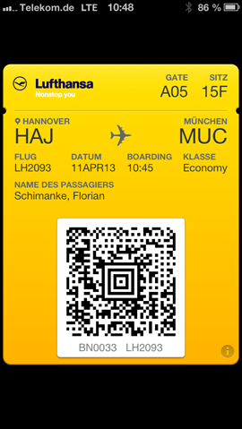 Die Anzahl der Passbook nutzenden Angebote im Alltag ist nach meiner persönlichen Wahrnehmung auch ein gutes halbes Jahr nach dem Start noch extrem überschaubar. Nehme ich mal meine ganz persönliche Nutzung von Passbook als Maßstab, kann ich in den vergangenen sieben Monaten genau ein einziges Mal zählen, bei dem ich es tatsächlich genutzt habe. Und zwar am vergangenen Donnerstag bei einem Flug mit der Lufthansa von Hannover nach München und zurück. Die Erfahrung die ich dabei gemacht habe, ist jedoch absolut erwähnenswert und zeigt das Potenzial von Passbook. Nach dem Check-in über die Lufthansa-App am Vortag des Fluges wurde mir die Ablage des digitalen Tickets in Passbook inkl. Sperrbildschirm-Integration angeboten, die ich dankend annham. Pünktlich am Flugtag tauchte der Pass dann auch in eben jenem Sperrbildschirm auf, zeigte mir die korrekte Boarding-Zeit an und blieb dort auch bis ich in München angekommen war. Wischt man das Icon (in diesem Fall das der Lufthansa-App) nach rechts, öffnete sich ohne Umwege das Ticket. Schloss man es wieder, kehrte man direkt in den Sperrbildschirm zurück. Sehr komfortabel, sehr intuitiv, sehr einfach. Beim Boarding also einfach den Pass aus dem Sperrbildschirm heraus geöffnet, auf den Scanner gelegt und ins Flugzeug gestiegen. Genau diese kleinen Alltags-Annehmlichkeiten sind es, die Apple mit dem Passbook realisieren will. Gelungen? Check.