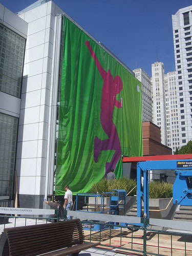 Am Dienstag steht uns ein Apple Special Event unter dem Motto "Let's Rock" bevor. Nun sind auch erstmals äußerliche Merkmale hierzu erkennen. So hat Apple die Fassade des Yerba Buena Center for the Arts Theater, in dem die Veranstaltung stattfindet, mit einem mehrere Stockwerke hohen Banner verkleidet, welches eine der bekannten Silhouetten aus der iPod-Werbung zeigt. Insofern wird auch auf diesem Wege noch einmal bestätigt, dass es sich bei dem Event in erster Linie um die iPod Familie drehen wird.