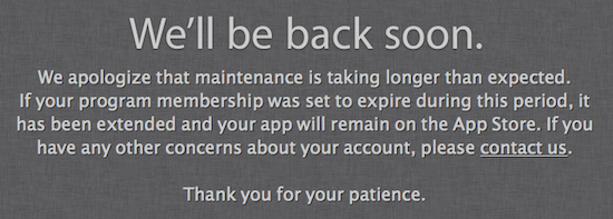 Bei Apple registrierte Entwickler dürften inzwischen festgestellt haben, dass bereits seit knapp zwei Tagen kein Zugriff auf Apples Developer Connection mehr besteht. Stattdessen wird man von der unten zu sehenden, sich in den vergangenen Tagen mehrfach veränderten Meldung begrüßt. Für Entwickler bedeutet dies letzten Endes, dass sie keinen Zugriff auf die Downloads der aktuellen Beta-Versionen von iOS 7, OS X Mavericks und Xcode haben, aber auch auf die Developer-Foren, Beispielcodes und Dokumentationen. Apple hat sich bislang außer dem Hinweis nicht weiter zu der Thematik geäußert. Immerhin sind demnach keine negativen Auswirkungen in jeglicher Hinsicht durch die Downtime zu erwarten. Die Spekulationen reichen nun von neuen Möglichkeiten für Entwickler bis zu einer kompletten Überarbeitung des Portals. Hält sich Apple an seinen Zwei-Wochen-Rhythmus der Zeit seit der WWDC, würden am Montag die jeweils vierten Vorabversionen von iOS 7 und OS X Mavericks abstehen. Möglich, dass Apple passend dazu die Developer Connection wieder in Betrieb nimmt.