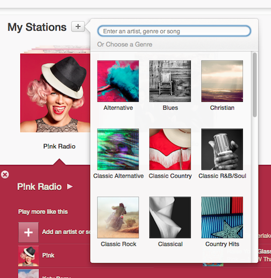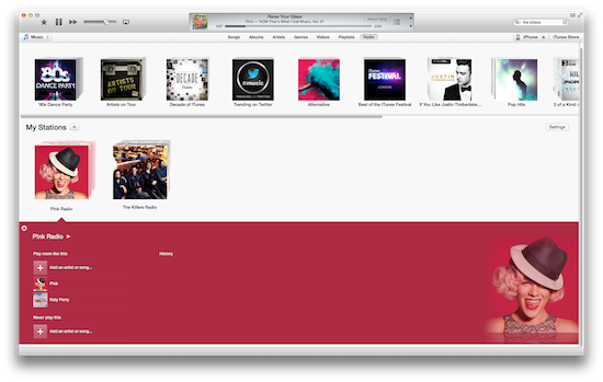 Während iTunes im oberen Teil des Hauptfensters vorkonfigurierte Radio-Stationen empfiehlt, darunter u.a. einen Sender mit Twitter #music, vom iTunes Festival oder auch der WWDC, kann man im unteren Bereich seine eigenen Sender konfigurieren. Diese können wahlweise auf einem Künstler, einem Song oder einem Genre basieren.