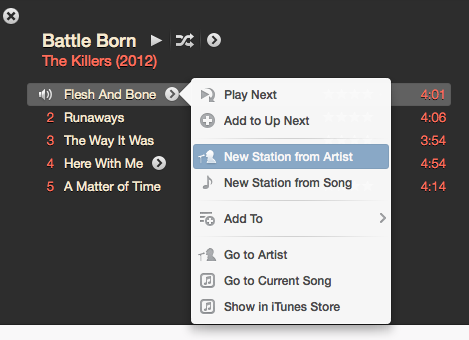Von hier aus lassen sich die erstellten Stationen dann auch weiter konfigurieren, beispielsweise mit ähnlichen Künstlern oder mit Songs, die von der Wiedergabe ausgeschlossen sein sollen. Auch in den generellen Musik-Teil von iTunes wurde iTunes Radio integriert. So kann man über das Kontextmenü von Künstlern oder Songs nunauch direkt einen Sender erstellen.